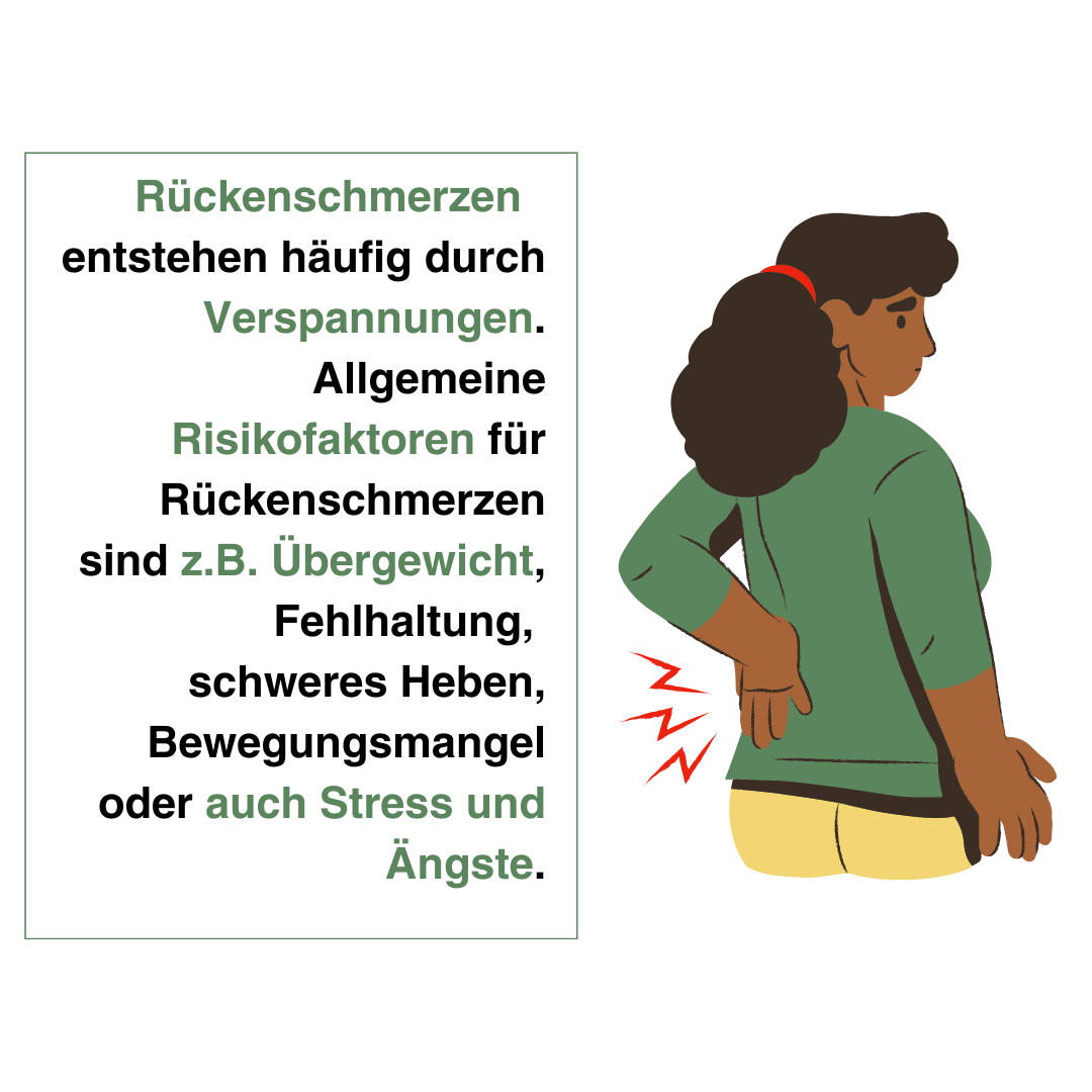 Eine der häufigsten Ursachen für Rückenschmerzen sind Verspannungen. Diese treten besonders bei z.B. falscher Haltung am Arbeitsplatz, Bewegungsmangel, falschem Heben und Tragen, Übergewicht oder aber auch durch Stress und Ängste auf. Bei einer solchen Verspannung kommt es im Körper zu entzündlichen Prozessen. Die Muskeln verhärten sich durch die Verspannung und reizen die Nervenwurzeln. Aus dieser Reizung wiederum resultieren Mikroentzündungen, welche sich unter anderem durch Schwellungen, Rötungen, Überwärmung und auch schmerzen äußern können.