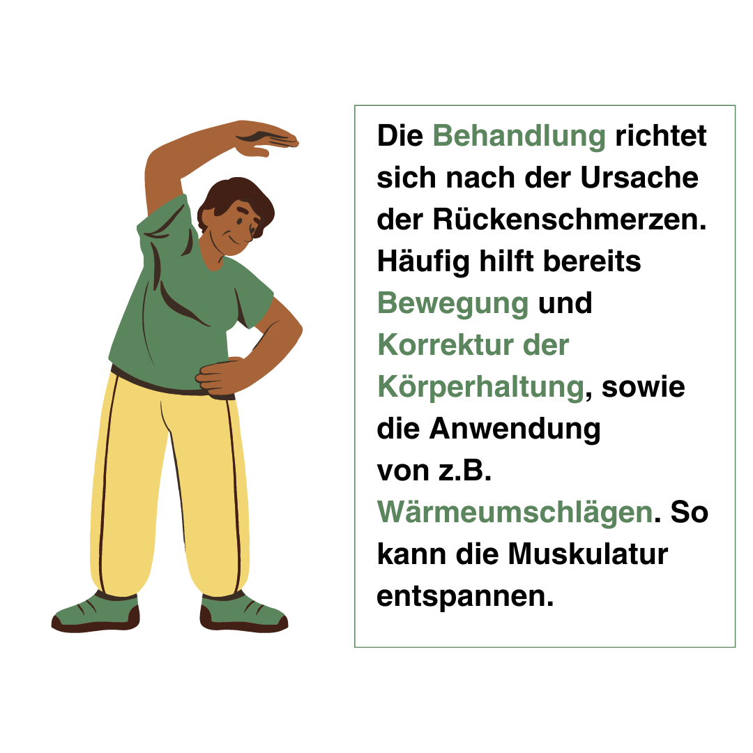 Ebenso wie die Symptome und die Diagnose, ist auch die Behandlung der Rückenschmerzen abhängig von der Ursache.