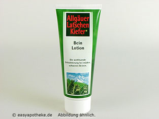 Allgäuer Latschenkiefer Bein Lotion belebt und erfrischt strapazierte Beine. Straffende Pflege der empfindlichen Haut an Wade und Oberschenkel. Die Beinlotion gibt trockener Haut an den Schienbeinen und Waden die fehlende Feuchtigkeit. Wirkt der Tonus-Schwäche in den Blutgefäßen der Waden und Oberschenkel entgegen, strafft und durchblutet Haut- und Unterhautgewebe im Bereich der Oberschenkel (z. B. bei ?Orangenhaut?). Bei bereits bestehenden venösen Stauungs erscheinungen kann eine Besserung und Schmerzlinderung eingeleitet werden.