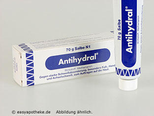 Antihydral Salbe wird zur Verringerung von starker Schweißabsonderung besonders an den Füßen, Händen und unter den Achseln eingesetzt. Die Salbe enthält den Wirkstoff Methenamin. Der Wirkstoff wirkt äußerlich schweißhemmend und antimikrobiell durch die Freisetzung von Formaldehyd im sauren Milieu. Durch die Antihydral Salbe wird die Schweißabsonderung nicht unterdrückt sondern normalisiert. Das Präparat wird 1 -2 Mal täglich aufgetragen. Schon nach wenigen Tagen wird die Haut trockener. Es reicht dann aus, die Salbe in größeren Abständen anzuwenden, wenn die Schweißbildung nachgelassen hat.