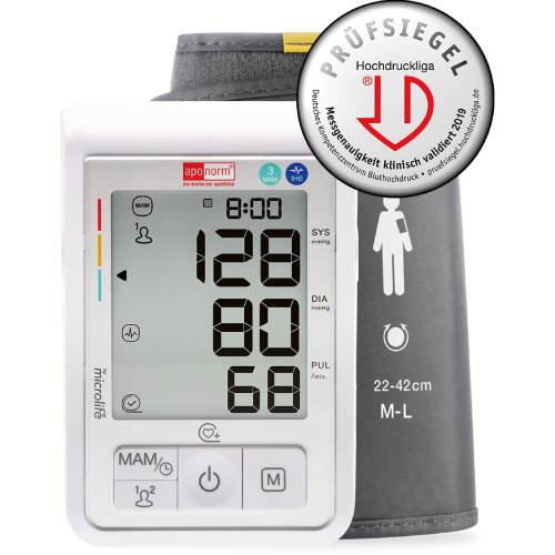 Das aponorm® Basis Control PLUS ist der Mehrfachmess-Spezialist unter den Blutdruckmessgeräten: Nur ein Knopfdruck genügt und das Modell führt mit nur kurzer Pausenzeit dazwischen hintereinander weg eine automatische Mehrfachmessung an Ihnen durch (Einzelmessung wahlweise möglich). Aus allen Messungen (mindestens drei, maximal fünf) wird im Anschluss ein gewichteter Mittelwert gebildet. Dieser ist nach Empfehlungen von Ärzten und Fachverbänden noch etwas genauer als ein Blutdruckwert, der nach einer Einfachmessung ermittelt wird. Und auch sonst bringt das Modell alles mit, was Sie für eine verlässliche Blutdruckmessung benötigen.