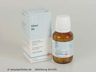 Biochemie DHU 11 Silicea D 6 Tabletten sind ein Dr. Schüssler Salz, welches in der Homöopathie zur Anwendung kommt. Die Tabletten enthalten Silicium (Kieselerde). Silicium steigert die Festigkeit des Bindegewebes und hält es elastisch. Außerdem ist es wichtig für den Aufbau der Finger-und Fußnägel sowie für Haut und Haare. Biochemie DHU 11 Silicea D 6 Tabletten können zur Vorbeugung einer Bindegewebsschwäche eingenommen werden. Das Salz wirkt sofort über die Mundschleimhaut und geht somit schnell ins Blut über.