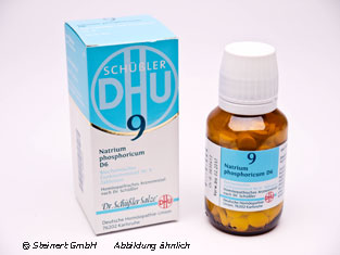 Die Biochemie DHU 9 Natrium phosphoricum D6 Tabletten werden zur natuerlichen Unterstuetzung des Stoffwechsels angewendet. Die Tabletten enthalten den homoeopathischen Wirkstoff Natriumphosphat. Durch das Natriumphosphat wird die Umwandlung von Harnsaeure in Harnstoff gefoerdert, so dass die Ausscheidung erleichtert wird. Bei zu viel Saeure im Koerper kann es zu ernsthaften Gesundheitsproblemen kommen. Neurodermitis kann durch zu viel Harnsaeure ausgeloest werden, so dass die entgiftende Wirkung sich auch positiv auf die Haut auswirken kann. Die Biochemie DHU 9 Natrium phosphoricum D6 Tabletten koennen auch die Bildung von Blasen- und Nierensteinen vermindern.