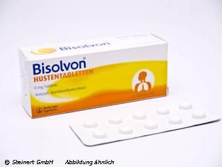 Bisolvon® Hustentabletten. Wirkstoff: Bromhexinhydrochlorid. Anwendungsgebiet: Zur Schleim lösenden Behandlung bei akuten und chronischen Erkrankungen der Bronchien und der Lunge mit zähem Schleim. Warnhinweis: Enthält Lactose. Apothekenpflichtig.