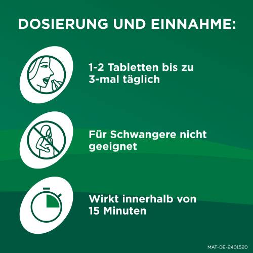 | Jugendliche ab 12 Jahren und Erwachsene | 1-2 Tabletten | 1-3 mal täglich | im Abstand von mindestens 8 Stunden, unabhängig von der Mahlzeit |