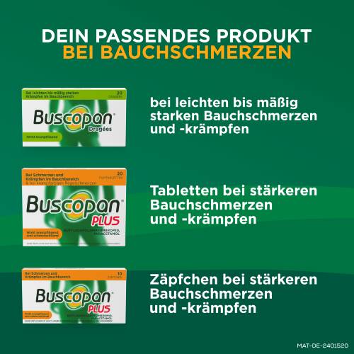 Ob im Magen, dem Darm, der Gebärmutter oder der Blase – Buscopan® PLUS ihr Spezialist, wenn es darum geht, Bauchschmerzen und -krämpfe zu lindern. Buscopan® PLUS ist als Filmtabletten und Zäpfchen erhältlich. Die am besten geeignete Dosierung kann der Packungsbeilage entnommen beziehungsweise von Ihrem Arzt oder Apotheker empfohlen werden.