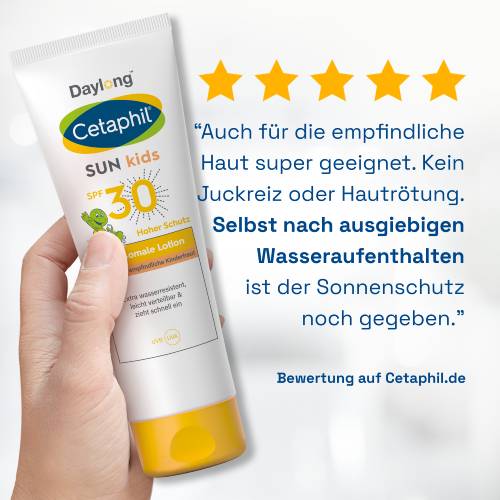 CETAPHIL Sun Daylong Kids SPF 30 liposomale Lotion ist speziell für die besonderen Ansprüche von empfindlicher Baby- und Kinderhaut entwickelt und bietet hochwirksamen UVA- und UVB-Schutz.