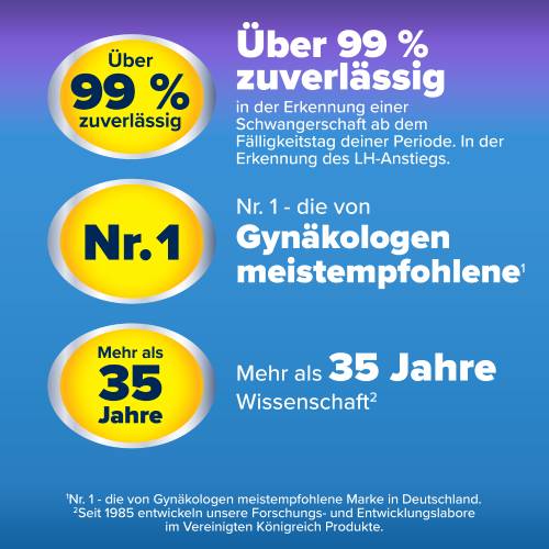 - Der einzige Test, der 4 oder mehr fruchtbare Tage identifizieren kann und so Ihre Chancen erhöht, schwanger zu werden – um mindestens das 2-Fache ggü. anderen Ovulationstests (2)