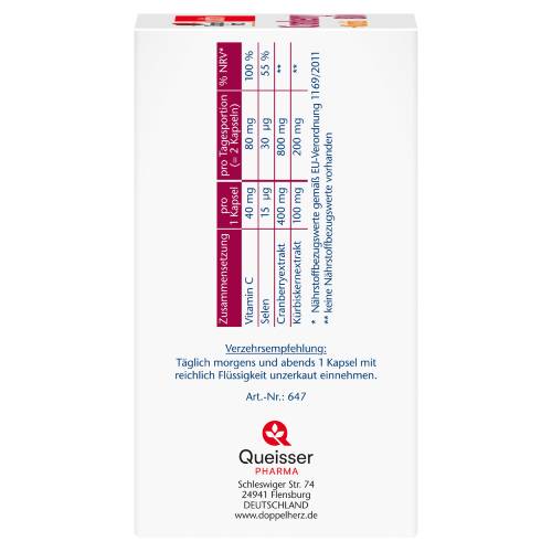 In den Kapseln von Doppelherz Cranberry + Kürbis sind 800 mg Cranberryextrakt, 200 mg Kürbiskernextrakt kombiniert mit 80 mg Vitamin C und 30 µg Selen als Tagesdosis (2 Kapseln).