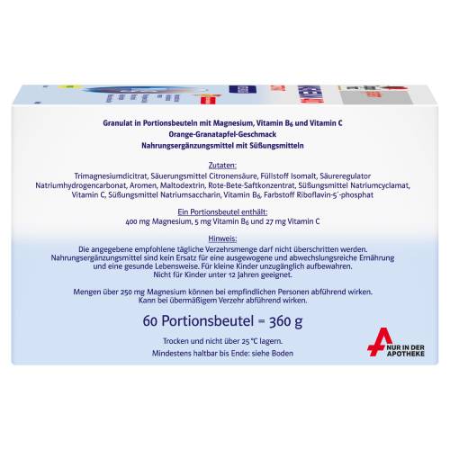 Die Portionsbeutel von Doppelherz system tragen mit 400 mg Magnesium in Citratform zu einer normalen Muskelfunktion und mit Vitamin B6 zur normalen Funktion des Nervensystems bei.