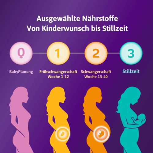 ¹Die ergänzende Aufnahme von Folsäure erhöht bei Schwangeren den Folatspiegel. Ein niedriger Folatspiegel bei Schwangeren ist ein Risikofaktor für die Entstehung von Neuralrohrdefekten beim heranwachsenden Fötus. Dafür sollten zusätzlich täglich 400 μg Folsäure über einen Zeitraum von mindestens einem Monat vor und bis zu drei Monaten nach der