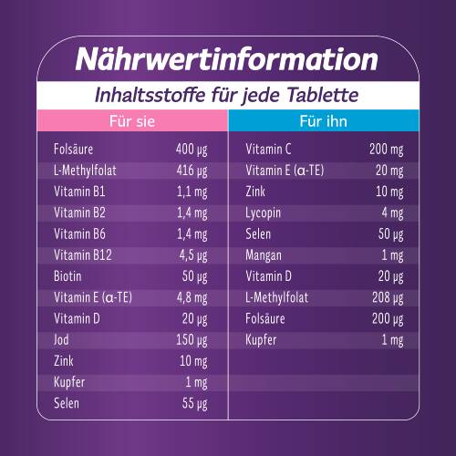 Daher ist es wichtig, dass sie bereits vor der Empfängnis Folsäure einnimmt. Die Formulierung enthält außerdem Zink², das zur normalen Fruchtbarkeit und Reproduktion² beiträgt, sowie Selen und Jod. Die Tablette für ihn ist speziell auf die Unterstützung der Spermienbildung2 und der normalen Reproduktion2 abgestimmt. Sie enthält Zink²,⁴ und Selen³, die zur normalen Fruchtbarkeit², Reproduktion², Erhaltung eines normalen Testosteronspiegels⁴ und zur normalen Spermienbildung³ beitragen – wichtige Faktoren für die Empfängnis. Die Formulierung beinhaltet auch Folsäure Plus1 , eine Kombination aus Folsäure und L-Methylfolat, sowie zusätzliche ausgewählte Nährstoffe wie die Vitamine C und E, die zum Schutz der Zellen vor oxidativem Stress beitragen.