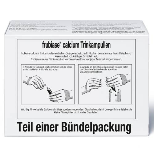 Die Frubiase Calcium T Trinkampullen werden zur Vorbeugung und Behandlung einer Osteoporose angewendet. Die Trinkampullen enthalten eine Kombination aus Calciumlactat und Calciumgluconat. Diese Wirkstoffkombination ist in der Lage eine Unterversorgung mit Calcium auszugleichen und so die Mangelerscheinungen zu lindern. Zu einem Calciummangel kann es unter anderem während der Schwangerschaft, Stillzeit oder bei Aufnahmestörungen kommen. Die Frubiase Calcium T Trinkampullen eignen sich auch zu Vorbeugung von Allergien.