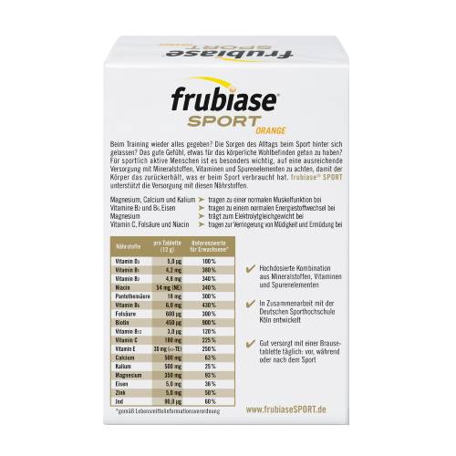 Die Frubiase Sport Brausetabletten werden zum Ausgleich des Verlustes an Vitaminen, Mineralstoffen und Spurenelementen durch das Schwitzen beim Sport angewendet. Die Brausetabletten enthalten eine ausgewogene Zusammensetzung genau dieser Nährstoffe. Ohne diese wichtigen Nährstoffe können viele verschiedene Funktionen im Körper nicht optimal ablaufen. Die im Wasser gelösten Brausetabletten können bereits während des Sports getrunken werden und verhindern so einen zu großen Verlust. Die Frubiase Sport Brausetabletten versorgen alle Sportler optimal und unterstützen eine ausgewogene Versorgung des Körpers.