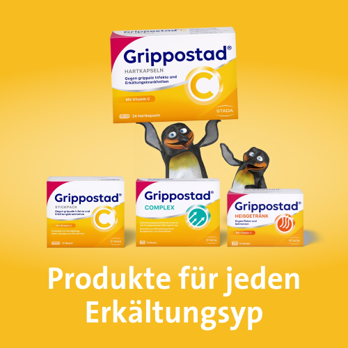 Erkältungen sind meist Virusinfektionen der Atemwege, die sich auf den ganzen Körper auswirken können. Viele Erkältete leiden bei einer Erkältung gleichzeitig an Schnupfen, Kopf- und Gliederschmerzen, Husten und Fieber. Alle diese Erkältungsbeschwerden gemein- sam können mit einem Kombi-Präparat bekämpft werden. Grippostad® C Kapseln sind Deutschlands meistverwendete Erkältungsmedizin bei Erkältungskrankheiten und grippalen Infekten. Sie enthalten eine Kombination aus Paracetamol, Chlorphenaminmaleat, Vitamin C und Coffein. Sie wirken gegen Reizhusten, Erkältungsfieber, Kopf- und Gliederschmerzen und Schnupfen in einem und lindern schnell diese gemeinsam auftretenden Erkältungssymptome. Die Dosierung der Wirkstoffe ist so abgestimmt, dass mit einem Minimum an Wirkstoff ein Maximum an Wirkung erzielt wird. Die Kapseln sind auch für Patienten mit Bluthochdruck, Asthma und Diabetes* geeignet.