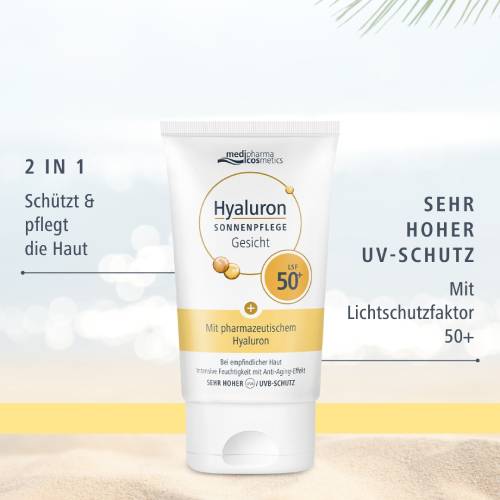 Die Hyaluron Sonnenpflege Gesicht LSF 50+ von medipharma cosmetics bietet empfindlicher und trockener Gesichtshaut zuverlässigen Schutz und intensive Feuchtigkeitspflege bei starker Sonneneinstrahlung.