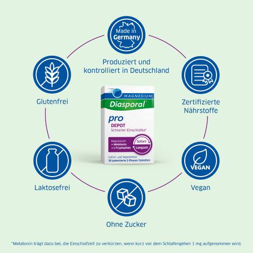 Magnesium-Diasporal® Pro DEPOT Schneller Einschlafen*, patentierte 2-Phasen-Tabletten Magnesium plus Melatonin und L-Tryptophan.