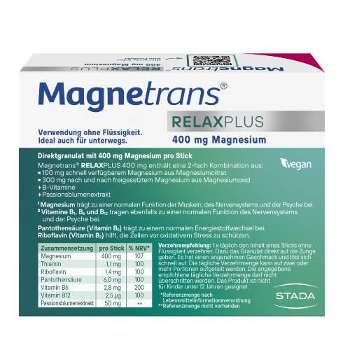 Ergänzt wird diese Wirkung durch die einzigartige Kombination aus 5 B-Vitaminen, die das Nervensystem unterstützen³, ⁴, und Passionsblumenextrakt, der traditionell zur Beruhigung bei innerer Unruhe und Anspannung eingesetzt wird. Diese harmonische Synergie bietet mit Magnetrans® RelaxPlus dein Plus an Entspannung.1,2,3,4
