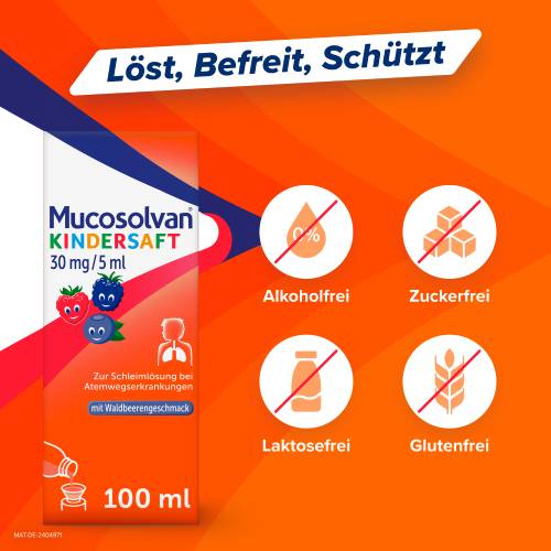 Hat sich bei Ihrem Kind ein zäher Hustenschleim in den Bronchien festgesetzt? MUCOSOLVAN® Kindersaft mit Waldbeergeschmack hilft dabei, das hartnäckige Sekret von den Schleimhäuten zu lösen und es aus dem Körper zu befördern. Der Wirkstoff Ambroxol verflüssigt den Schleim und regt die Bewegung der Flimmerhärchen an, sodass dieser einfacher aus den Atemwegen abtransportiert werden kann.