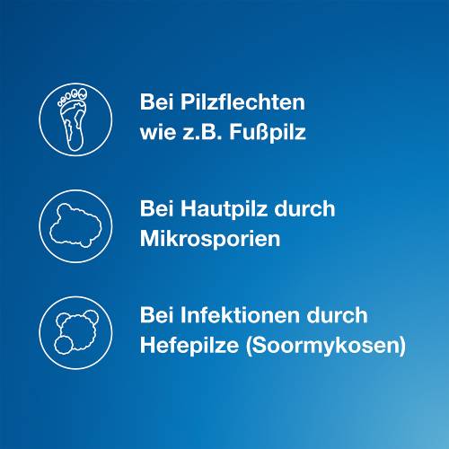 Die Anwendung sollte nach eingetretener Beschwerdefreiheit noch mindestens 1 Woche fortgesetzt werden. Ohne ärztlichen Rat sollten Sie das Arzneimittel nicht länger als 2 Wochen anwenden, wenn keine Besserung der Beschwerden nach dieser Zeit eingetreten ist. Die durchschnittliche Behandlungsdauer beträgt: bei Hefepilz-Infektionen: 2-3 Wochen, bei Hautpilz-Infektionen 3-4 Wochen, bei Fußpilz bis zu 6 Wochen.