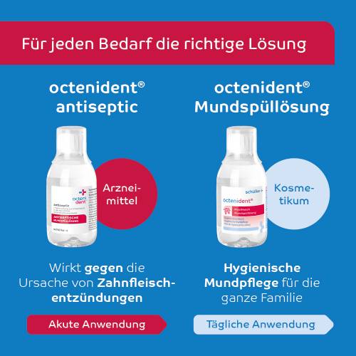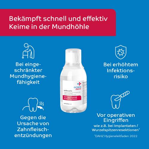 Wirkstoff: Octenidindihydrochlorid. Anwendungsgebiete: octenident® antiseptic hat eine antimikrobielle Wirksamkeit. Es wird angewendet zur vorübergehenden Keimzahlreduktion in der Mundhöhle, zur vorübergehenden Hemmung der Plaque-Bildung und bei eingeschränkter Mundhygienefähigkeit (z.B. wenn kein Zähneputzen möglich ist) bei Erwachsenen.