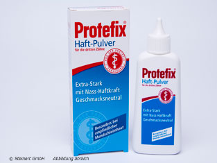 Zum Auftragen auf Zahnprotesen, PROTEFIX Haft-Pulver gleichmäßig und dünn auf die saubere, angefeuchtete Prothese streuen. Gebissplatte einsetzen und andrücken.