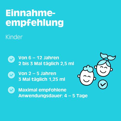 Erwachsene und Jugendliche über 12 Jahre: 3-mal täglich 5 ml für 2 – 3 Tage, danach 2 Mal täglich 5 ml.