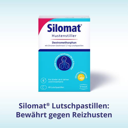 Silomat® Hustenstiller Dextromethorphan mit Zitronen-Geschmack 7,7 mg Lutschpastillen. Zur Anwendung bei Kindern ab 6 Jahren und Erwachsenen Wirkstoff: Dextromethorphanhydrobromid-Monohydrat. Zur symptomatischen Behandlung von Reizhusten. Bei Reizhusten handelt es sich um einen trockenen Husten, bei dem kein Schleim abgehustet wird (unproduktiver Husten). Hinweis: Nicht mehr und nicht länger anwenden als empfohlen. Enthält Maltitol, Cyclodextrin(e) und Levomenthol.
