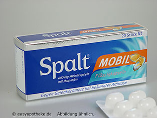 Die Spalt Mobil Weichkapseln werden zur Linderung von Gelenkschmerzen und arthrosebedingten Schmerzen angewendet. Die Weichkapseln enthalten 400 mg des Wirkstoffe Ibuprofen, in einer vollständig gelösten Form. Durch die gelöste Form kommt es zu einem sehr schnellen Wirkungseintritt. Der quälende Schmerz wird innerhalb von wenigen Minuten zuverlässig gelindert. Die Spalt Mobil Weichkapseln werden bei einer bekannten Arthrose eingesetzt, das heißt, wenn der Arzt einen Gelenkverschleiß festgestellt hat.