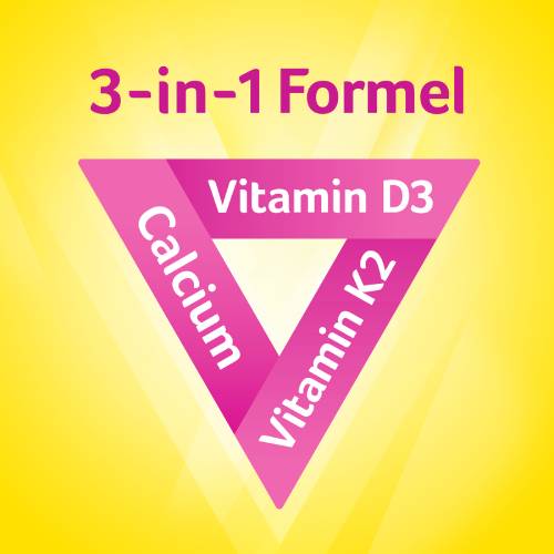 Es enthält 1000 IE Vitamin D3 zur Unterstützung der Kalziumaufnahme, 75 µg Vitamin K2 für den Kalziumeinbau in den Knochen und 500mg Kalzium als essenzieller Baustein für gesunde Knochen*.